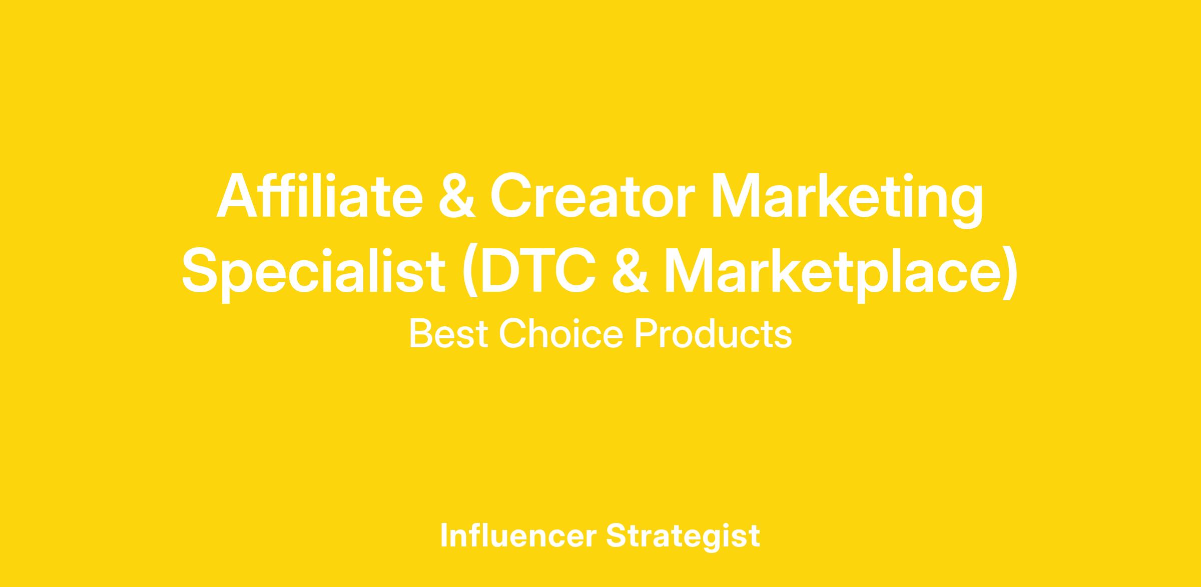 The Affiliate & Creator Marketing Specialist (DTC & Marketplace) drives performance across Best Choice Products’ marketplace and DTC channels through affiliate, creator, and influencer partnerships. This role focuses on developing and managing relationships with creators and affiliates that drive awareness, engagement, and revenue. This position works cross-functionally to ensure all partnership efforts align with key product, promotional, and marketing priorities.