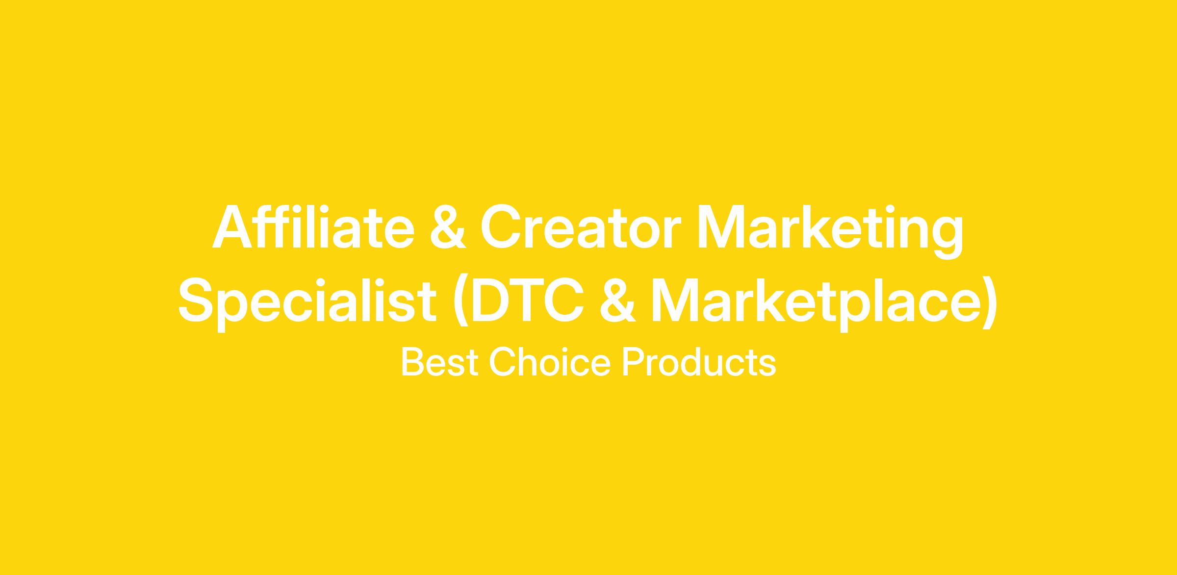 The Affiliate & Creator Marketing Specialist (DTC & Marketplace) drives performance across Best Choice Products’ marketplace and DTC channels through affiliate, creator, and influencer partnerships. This role focuses on developing and managing relationships with creators and affiliates that drive awareness, engagement, and revenue. This position works cross-functionally to ensure all partnership efforts align with key product, promotional, and marketing priorities.