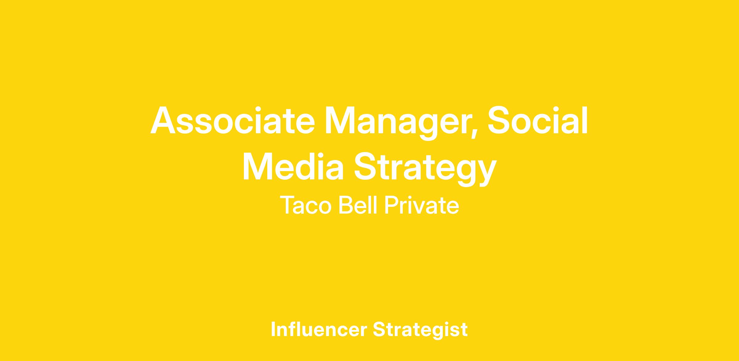 The Taco Bell social team is an industry-leading group that develops and builds a breakthrough brand presence, innovative programs and leading community engagement for Taco Bell across social channels and platforms. As the Associate Manager, Social Strategy, you’ll be leading the creative strategy and development of all product-centric social communications for a key aspect of our menu (Cantina and Crispy Chicken) designed to build awareness for Taco Bell, drive restaurant visits and fuel the Taco Bell cult. Reporting directly to the Social Manager, this role will focus primarily on the following: