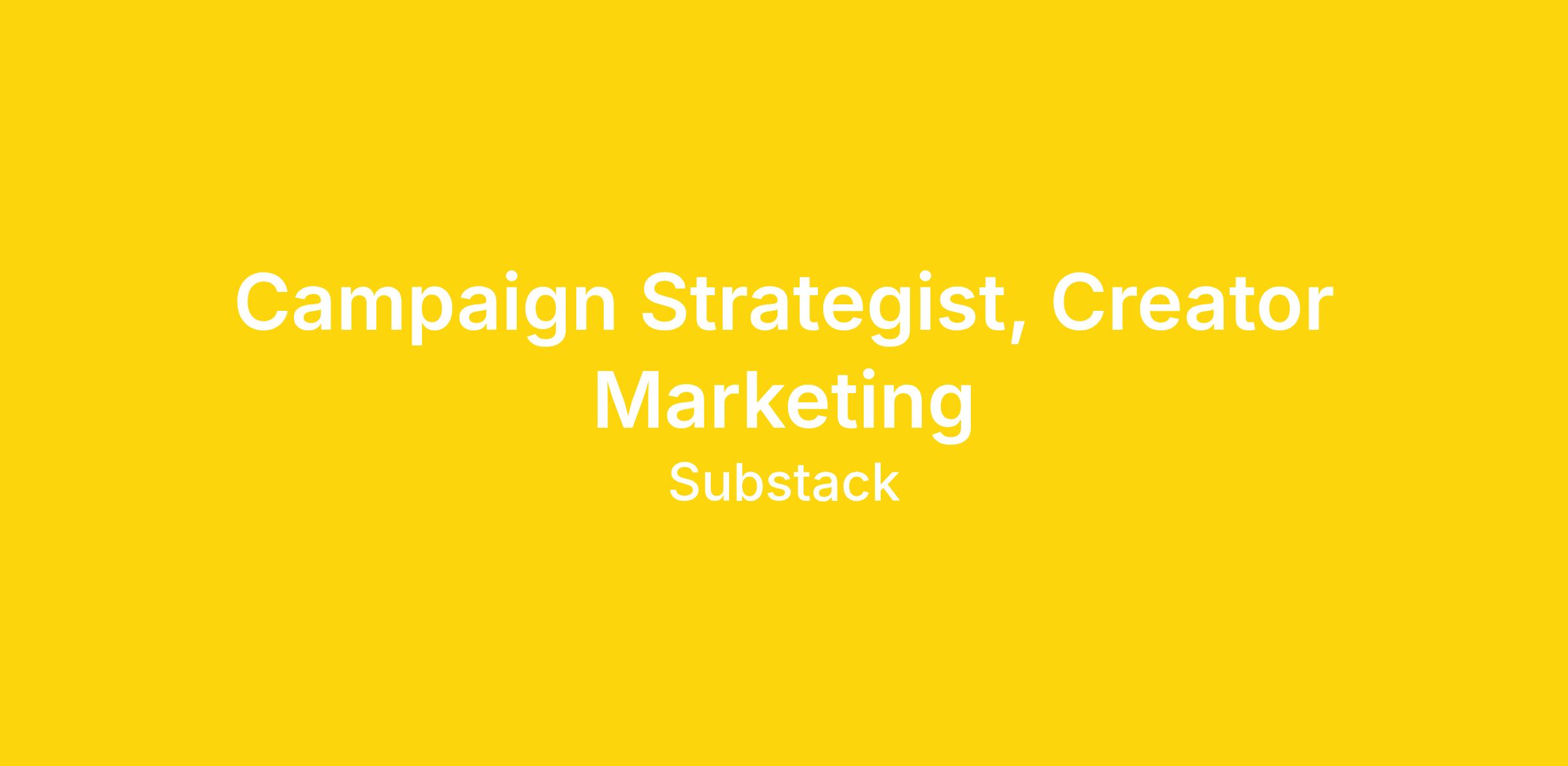 As a Campaign Strategist on the Creator Marketing team, you'll build creative and strategic work that brings Substack's brand to life for writers, creators, and thinkers. You'll help concept and execute campaigns that inspire people to go independent — from big cultural moments to targeted programs that activate key creator segments. This is a role for someone who thinks in narratives, writes with conviction, and knows how to turn an idea into a campaign that earns attention.