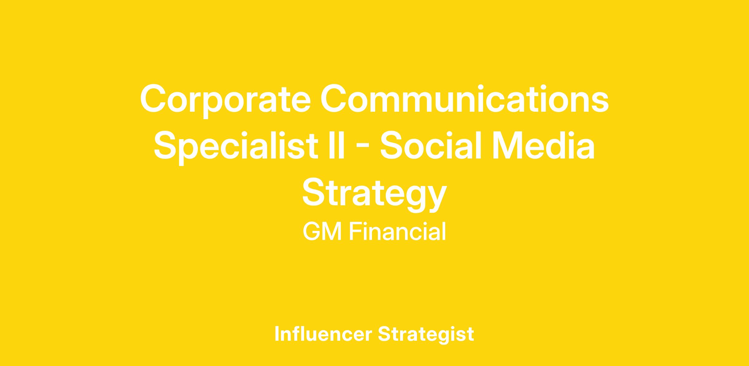 The Corporate Communication Specialist II - Social Media Strategy supports the KEYS® by GM Financial brand in its promotional efforts with a focus on social media and a goal of executing work that aligns with brand and social strategies. KEYS is our financial literacy program that seeks to empower smarter financial decisions by offering free financial resources. This includes the keysbygmfinancial.com website, the Our Two Cents podcast and event marketing.
