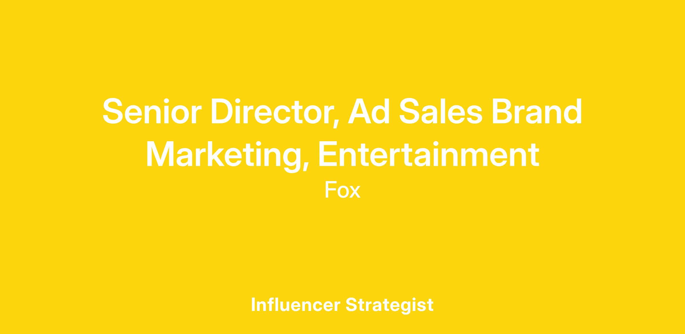 Fox CorporationUnder the FOX banner, we produce and distribute content through some of the world’s leading and most valued brands, including: FOX News Media, FOX Sports, FOX Entertainment, FOX Television Stations and Tubi Media Group. We empower a diverse range of creators to imagine and develop culturally significant content, while building an organization that thrives on creative ideas, operational expertise and strategic thinking.FOX has an exciting opportunity for a Senior Director, Ad Sales Brand Marketing, FOX Entertainment. In this new role, the Senior Director, Ad Sales Brand Marketing will partner with key stakeholders to lead the development and execution of go-to-market strategies and materials that increase visibility with agencies and clients and drive demand in the digital and linear advertising marketplace for FOX Entertainment. The Senior Director, Ad Sales Brand Marketing will report to the VP of Ad Sales Brand Marketing and will manage a Senior Coordinator.