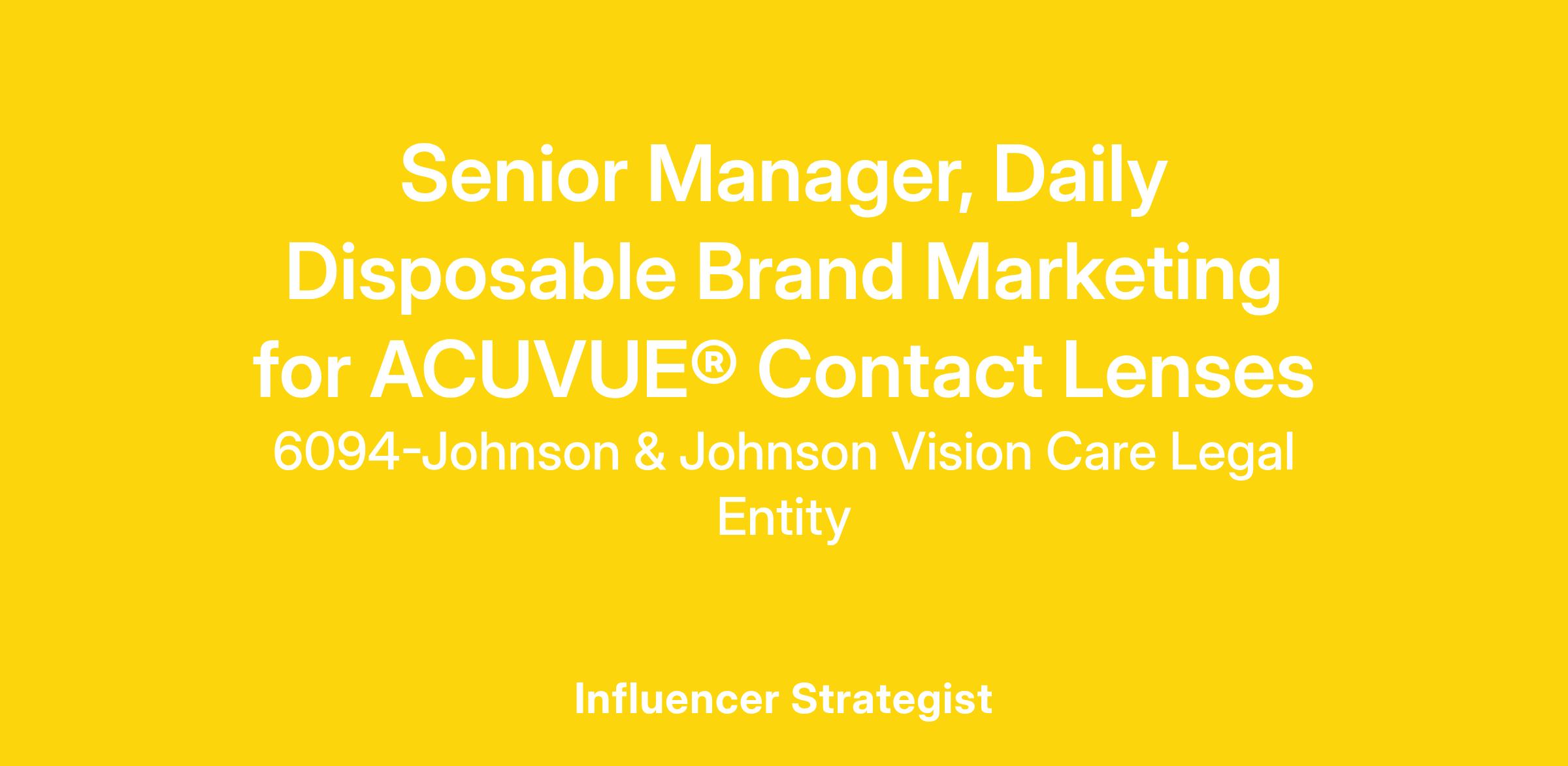 Purpose: The Senior Manager, Daily Disposable Brand Marketing for ACUVUE® Contact Lenses, will lead the comprehensive brand stewardship of an ACUVUE® Daily Disposable brand family to enhance professional brand equity and drive business growth across the daily disposable contact lens portfolio. This position partners closely with other commercial functions to drive execution excellence and Global Strategic Marketing to shape the innovation and pipeline agenda. This role reports to the Director, Daily Disposable Brand Marketing within the U.S. Marketing department.