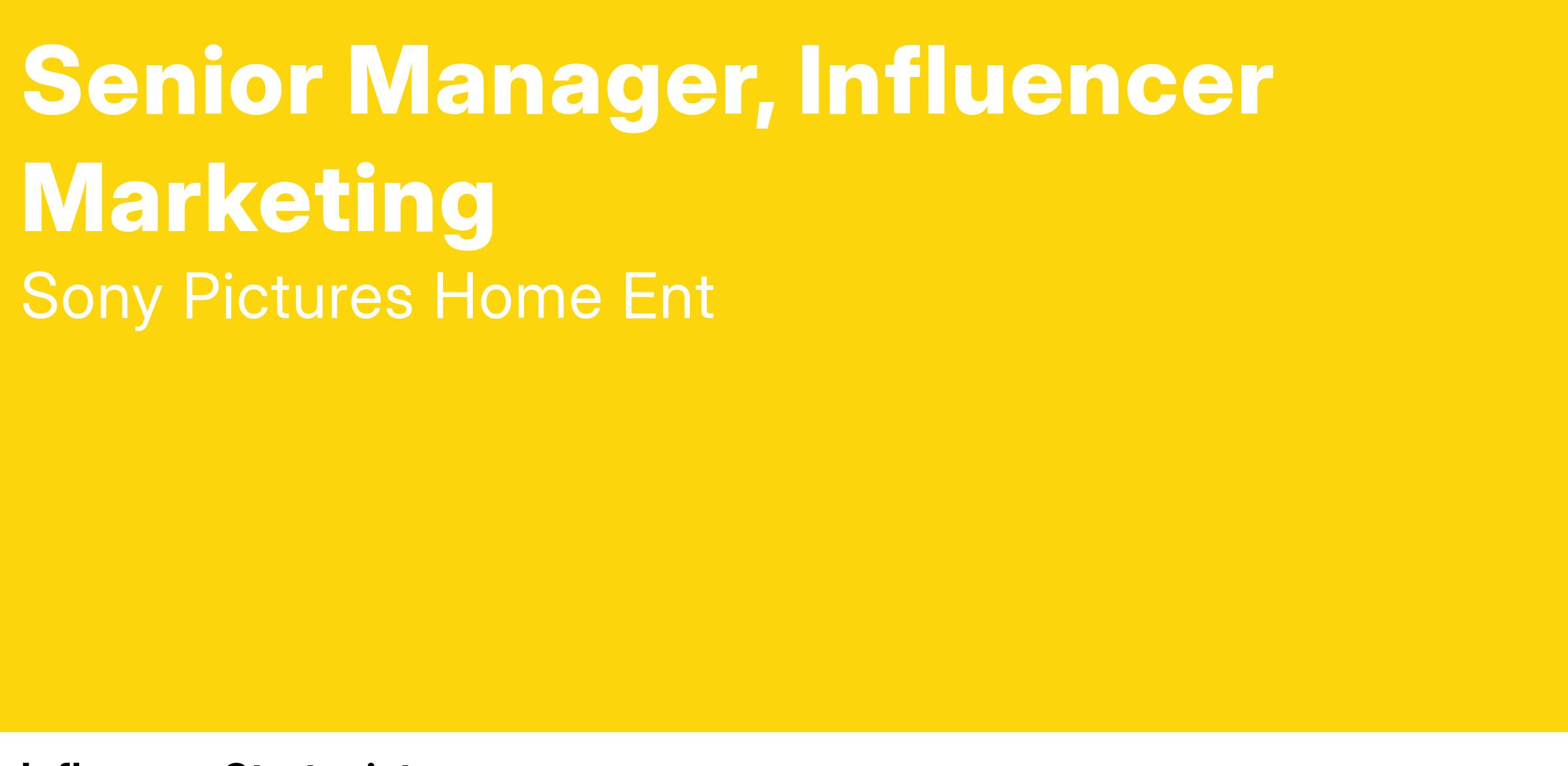 The Senior Manager, Influencer and Creator Marketing will support the Sony Pictures Influencer and Creator Marketing practice across Sony Pictures Entertainment for theatrical and lifecycle. As a key pillar for all campaigns, this role is charged with helping to develop and execute influencer & creator strategy through identifying the most appropriate influencers & creators to work with on a given campaign, directing the creative work to build and launch content and tracking the results to make sure they are successful and align with campaign goals.