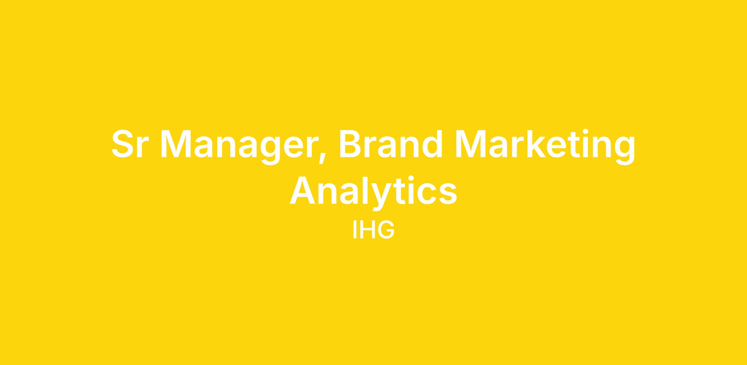 The Sr. Manager of Marketing Analytics, Brand is the measurement engine behind IHG's brand growth strategy. This role exists to give brand marketing and paid media teams the analytical confidence to make smarter decisions on where to invest, who to reach, and how to measure what's working. You will translate complex brand health and media data into clear, actionable intelligence that shapes media strategy and drives awareness, consideration, and favorability across the full funnel.
