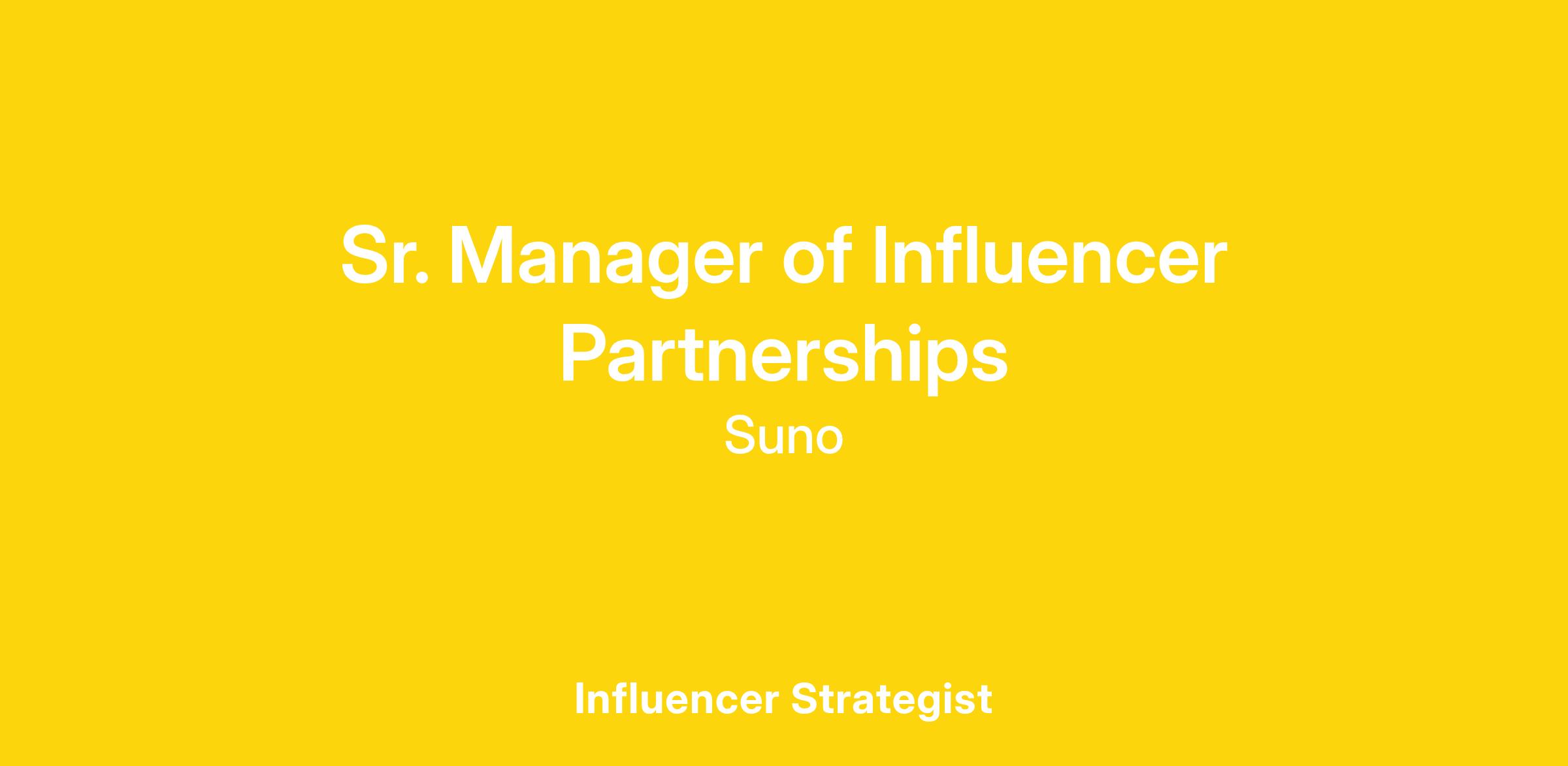 Suno is seeking an Sr. Manager of Influencer Partnerships & Marketing to help manage our content efforts across organic and paid content. In this role, you will be responsible for planning and executing end-to-end influencer campaigns that build awareness, grow adoption, and deepen engagement with Suno amongst a range of audiences. You will collaborate with a variety of stakeholders across our company, including product and growth, to develop strategies, plans, and campaigns in support of our marketing and business goals.